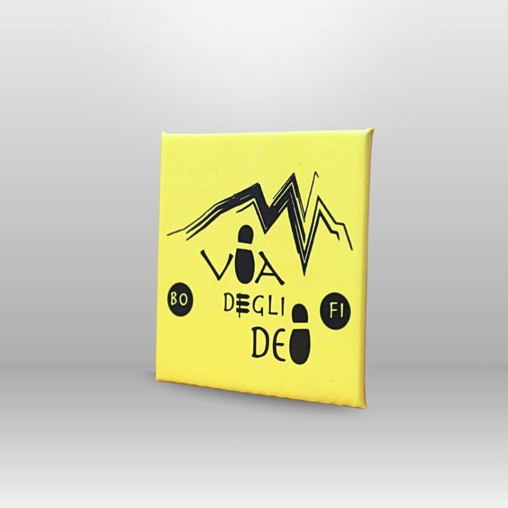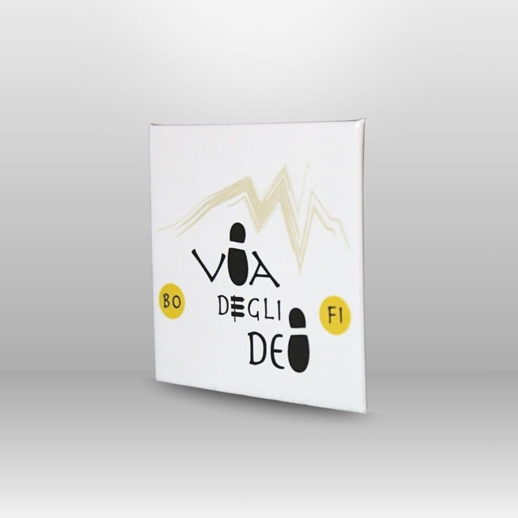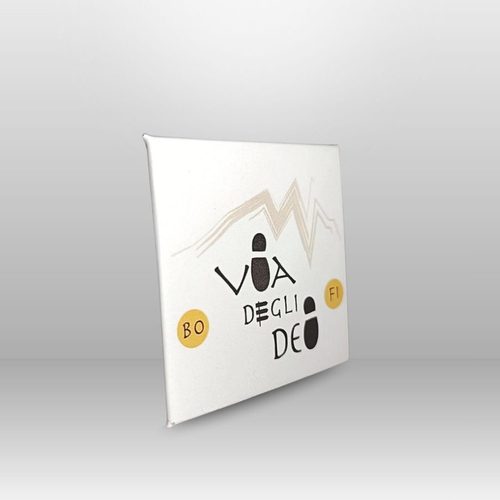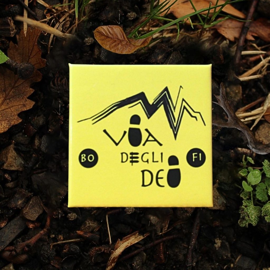 La Calamita Via degli Dei è un piccolo gadget quadrato (52×52 mm, spessore 0,75 mm) che riproduce il logo ufficiale del cammino.
