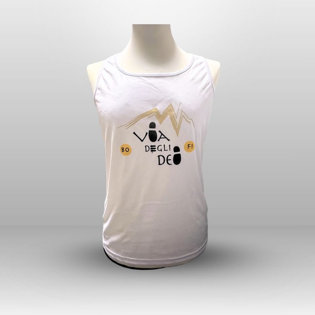 Canotta ufficiale Via degli Dei in tessuto tecnico 100% traspirante, leggera e confortevole, disponibile in taglie S, M e L.
