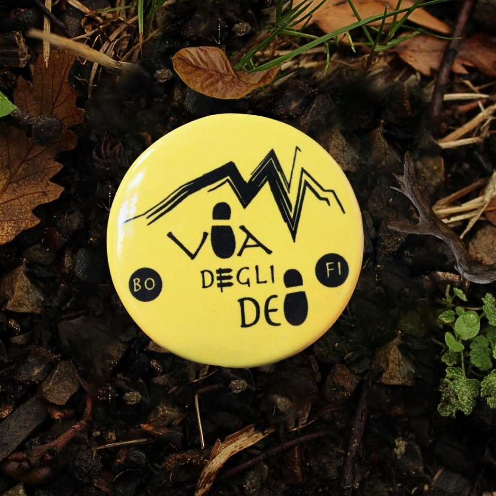 Spilla ufficiale della Via degli Dei, disponibile nei colori bianco e giallo. Un piccolo simbolo del cammino.