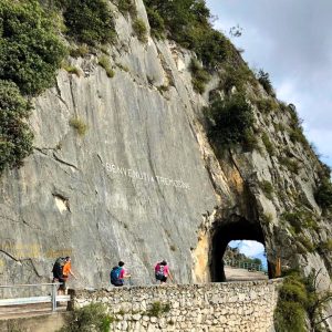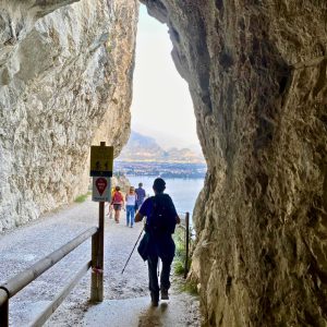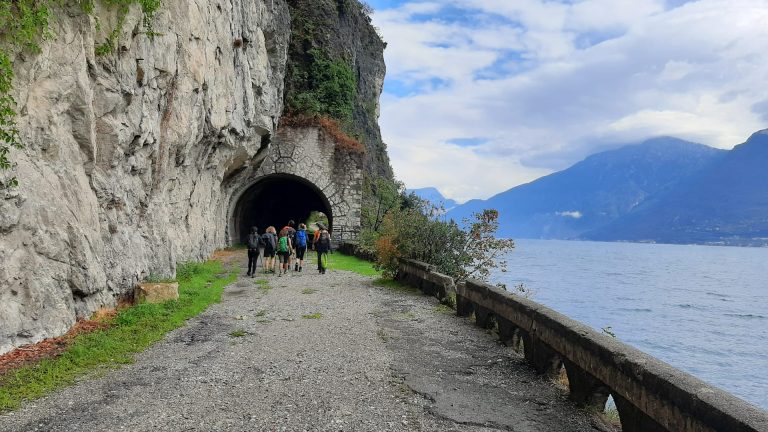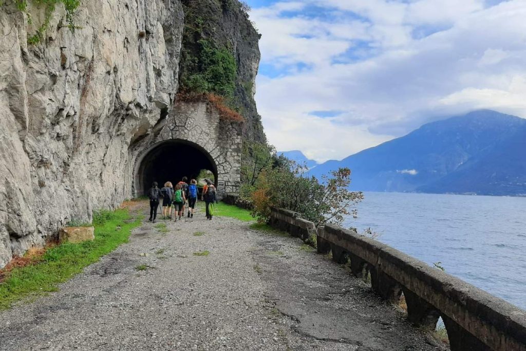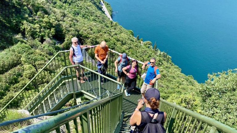 Partiremo da Riva entrando nel Parco delle Busatte, dove affronteremo i celebri 400 gradini sospesi che scendono lungo pareti rocciose con vista spettacolare sul lago. Successivamente, attraverseremo una lunga galleria con un mezzo dedicato per riprendere il percorso.