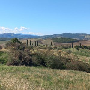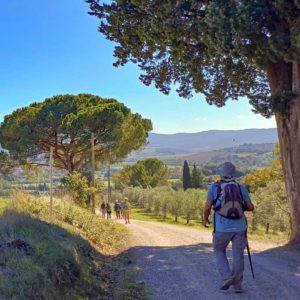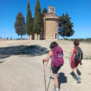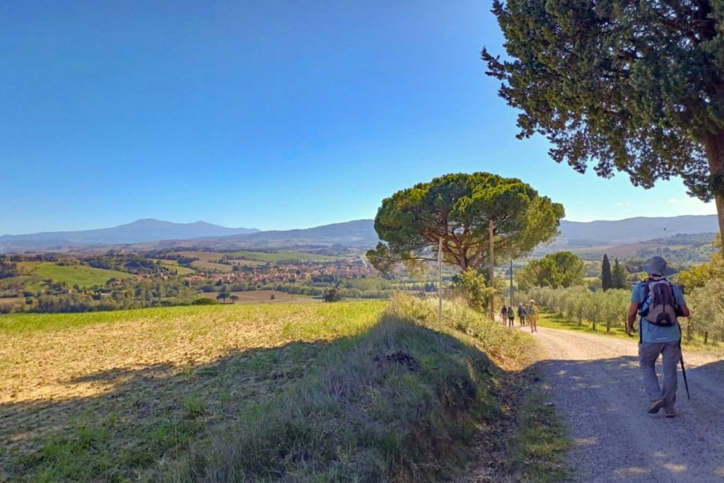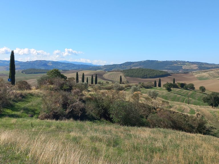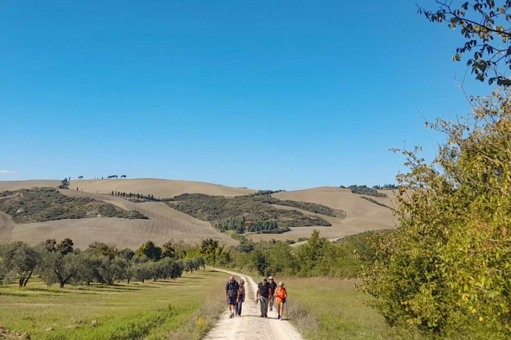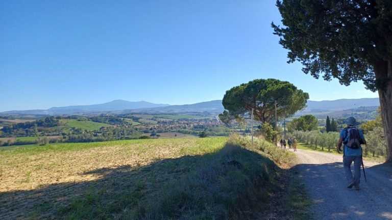 Passo dopo passo attraverseremo borghi medievali che conservano intatta la loro atmosfera, tra piazzette quiete, torri in pietra, pievi romaniche e lunghi filari di cipressi che accompagnano lo sguardo oltre l’orizzonte. Il cammino ci porterà dentro una Toscana autentica, fatta di colline dorate, vigneti, campi coltivati e panorami che raccontano l’essenza più profonda di questa terra.